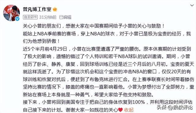 近5个半月前4月29日,小曾在比赛里遭遇了严重的腰伤。原本休赛期的计划受到了极大的影响,遗憾的错过了个人特训和若干NBA球队的试训邀请。期间,小曾经历了卧床、静养、康复,回到球场训练已经是近三个月后的八月初。宝贵的夏天就这样流逝了。为了珍惜这次机会和这个宝贵的冲击NBA的窗口,仅仅20天的有球训练和恢复对抗后,便赶到了布鲁克林进行汇合。在上赛季联赛长时间带着膝伤坚持比赛的情况下,膝盖的疼痛也一直影响着他。小曾为梦想付出了全部努力,重新站在赛场上本身就是一种勇气,希望大家给予他支持和鼓励。