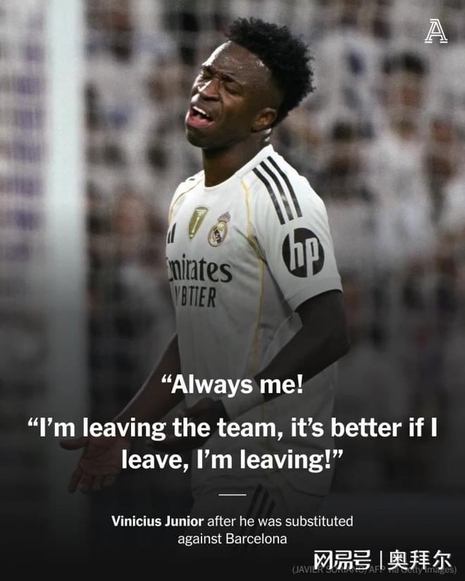 在伯纳乌对阵巴萨的第72分钟,维尼修斯被换下,这让维尼修斯非常不满,对着替补席大喊,“我?是我?教练,教练!是我吗?”“总是我!我要离开球队!我要离开,最好是我离开!”