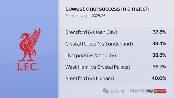 1:本场利物浦只赢得了38.8%的对抗,创造了本赛季英超所有比赛第三低的对抗成功率。