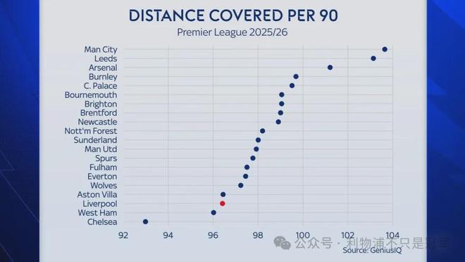 本赛季英超各队场均跑动距离,曼城高居第一,而利物浦,你可能难以置信,仅排倒数第三。