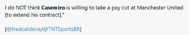 曼联目前正在与马奎尔就新合同进行谈判,不过尚未对卡塞米罗的合同状况采取行动。「TNT Sport」的弗雷德·卡尔德拉称,卡塞米罗不接受降薪续约曼联的条件。