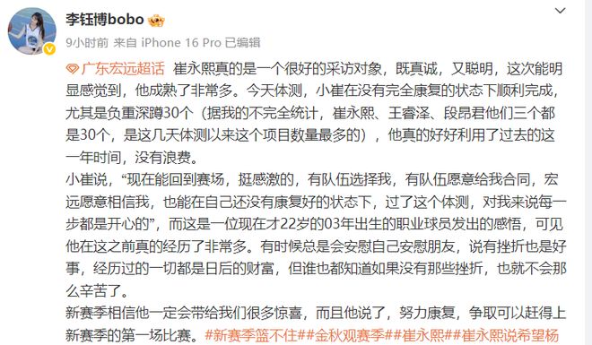 她写道:小崔在没有完全康复的情况下顺利完成体测,这一年他真的没有浪费,这位22岁的球员发出最真挚的感悟,可见他之前真的经历非常多。
