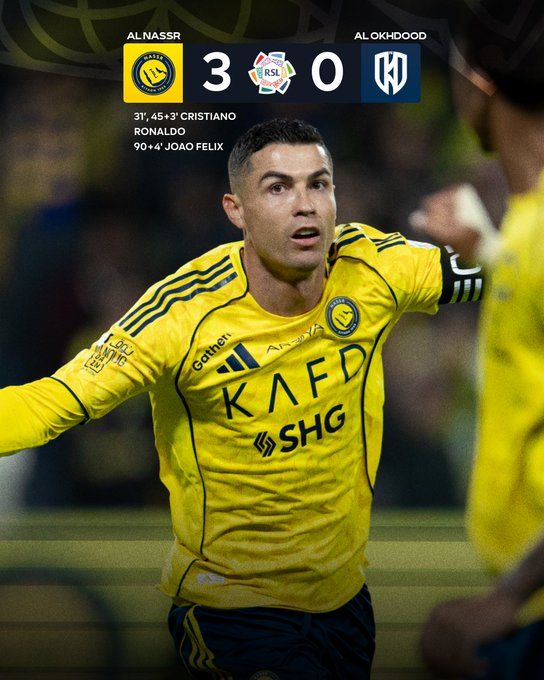 北京时间12月27日22:50,沙特联第11轮,利雅得胜利主场迎战阿科多。上半场C罗梅开二度+斩获生涯第956球,下半场C罗进球越位无效,菲利克斯补时锦上添花。最终利雅得胜利主场3-0战胜阿科多,胜利联赛开局豪取10连胜+4分优势领跑。