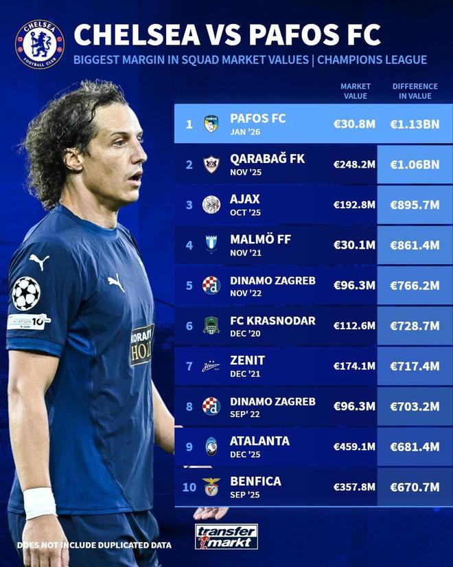 依照德转的数据,帕福斯目前全队的身价仅为3080万欧元,而切尔西则高达11.7亿欧元,两队整整相差了近11.3亿欧元。