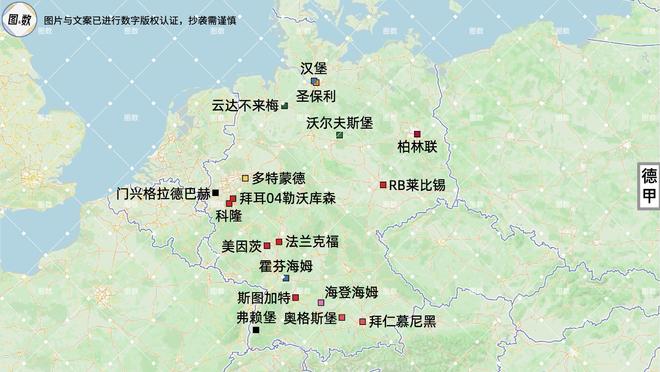 门兴格拉德巴赫是位置最西的德甲球队,柏林联是位置最东的德甲球队,弗赖堡是德甲及德国三级职业足球联赛最南的球队,汉堡是位置最北的德甲球队。