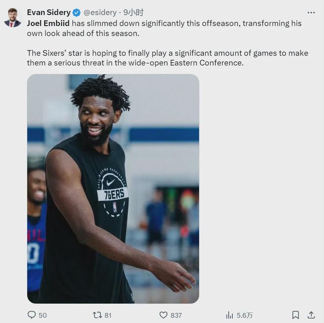 Sidery表示,恩比德已成功减重了几十斤,而且对于新赛季的征程信心满满。