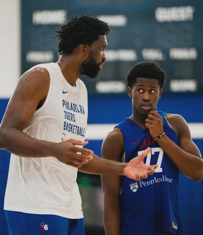 在76人的官方晒照里,还能看到恩比德在指点今年选中的探花秀埃奇库姆。