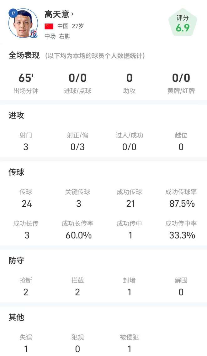 24次传球,3次关键传球,21次成功传球,传球成功率87.5%