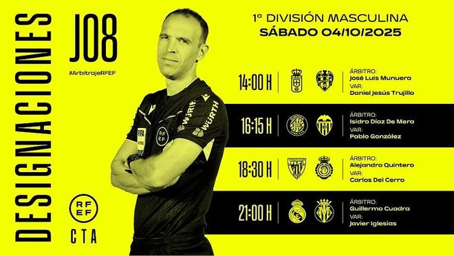 西班牙足协官方公布了周六西甲比赛裁判安排,夸德拉将执法皇家马德里vs比利亚雷亚尔。