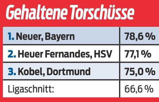 《体育图片》统计了本赛季截止目前德甲球队门将的扑救成功率,老将诺伊尔以78.6%的扑救成功率占据首位。排名第二的是升班马汉堡的门将费尔南德斯,其扑救成功率是77.1%。排名第三的是多特蒙德门将科贝尔,其扑救成功率为75%。