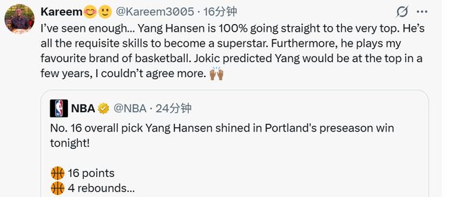 美国球迷转发NBA官方发布的杨瀚森集锦,评价杨瀚森:“我已经看够了(他的表现)……杨瀚森百分之百会直奔顶峰。他具备成为超级巨星所需的一切必要技能。此外,他打的篮球正是我最喜欢的那种风格。约基奇预测杨瀚森几年内就会达到顶尖水平,我完全赞同。”