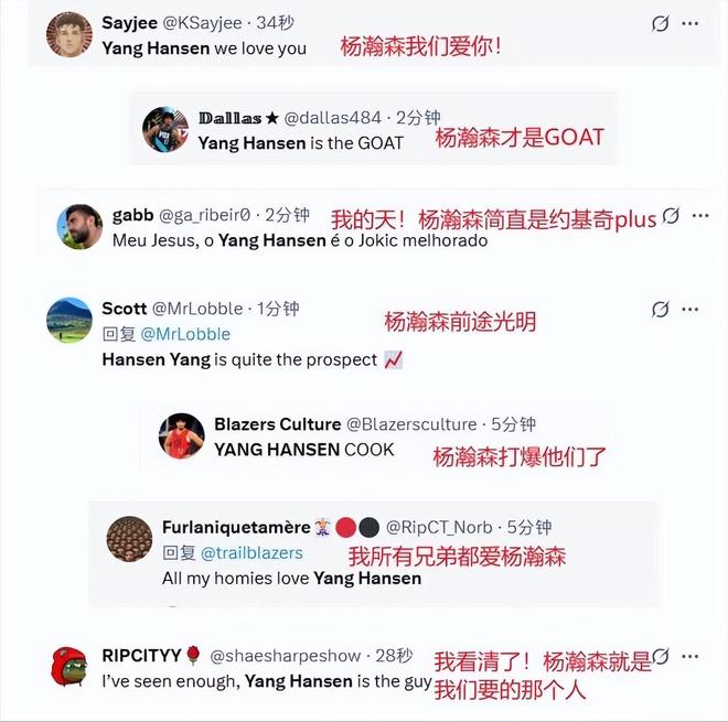 其中开拓者官方就直接发文表现杨瀚森太疯狂了。还有媒体表示:杨瀚森打球就像小女孩一样转圈跳来跳去,好久没有对开拓者队如此兴奋了,我看得够多了,杨瀚森就是我们需要的那个人。当然了,美国网友说的更甚,有网友评论道:“杨瀚森将是最佳新秀”。“我的天,杨瀚森简直是约基奇plus”,甚至还有球迷表示杨瀚森才是GOAT。对于杨瀚森的表现和未来前景,大家怎么看呢?