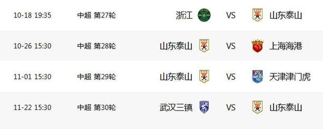中超争冠进入白热化,泰山队无欲无求,最后四场充当“生死判官”。10月18日,中超第27轮,泰山客战浙江队,10月26日,第28轮,泰山VS上海海港!这场强强对话也是海港争取实现三连冠伟业的关键一战。11月1日第29轮,泰山VS天津津门虎,11月22日,第30轮,泰山客战武汉三镇。